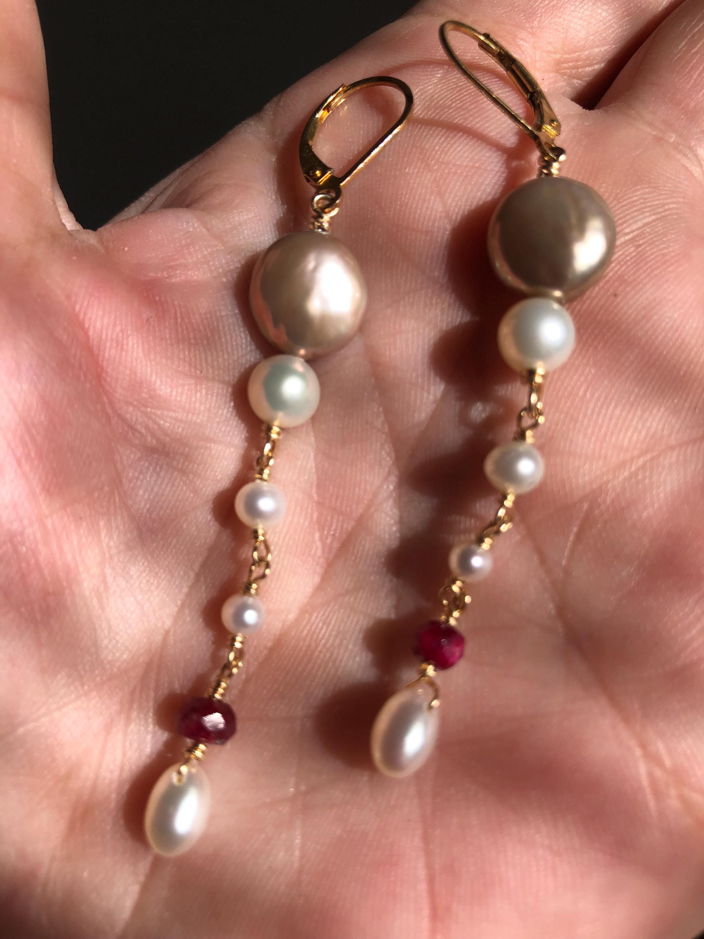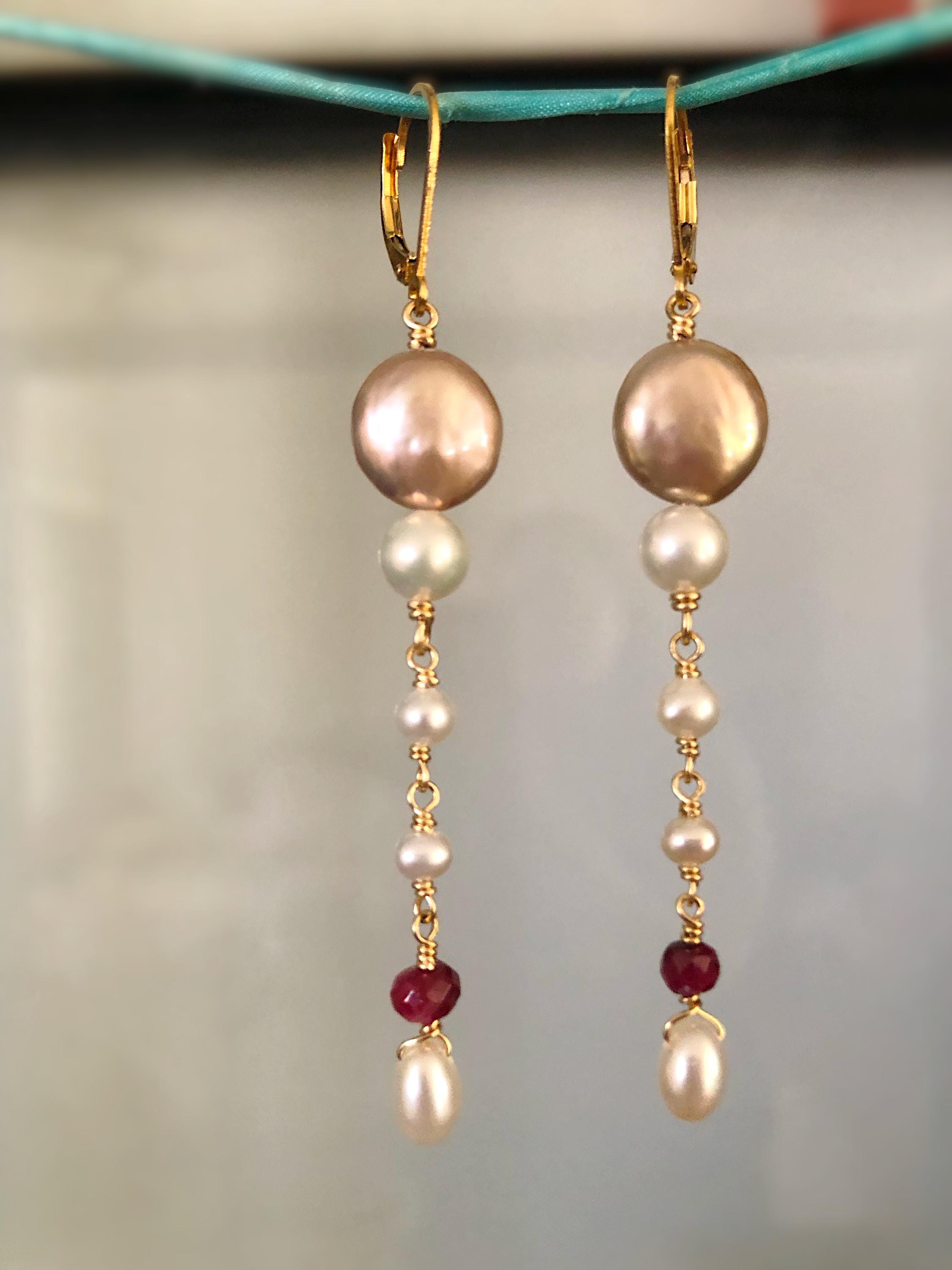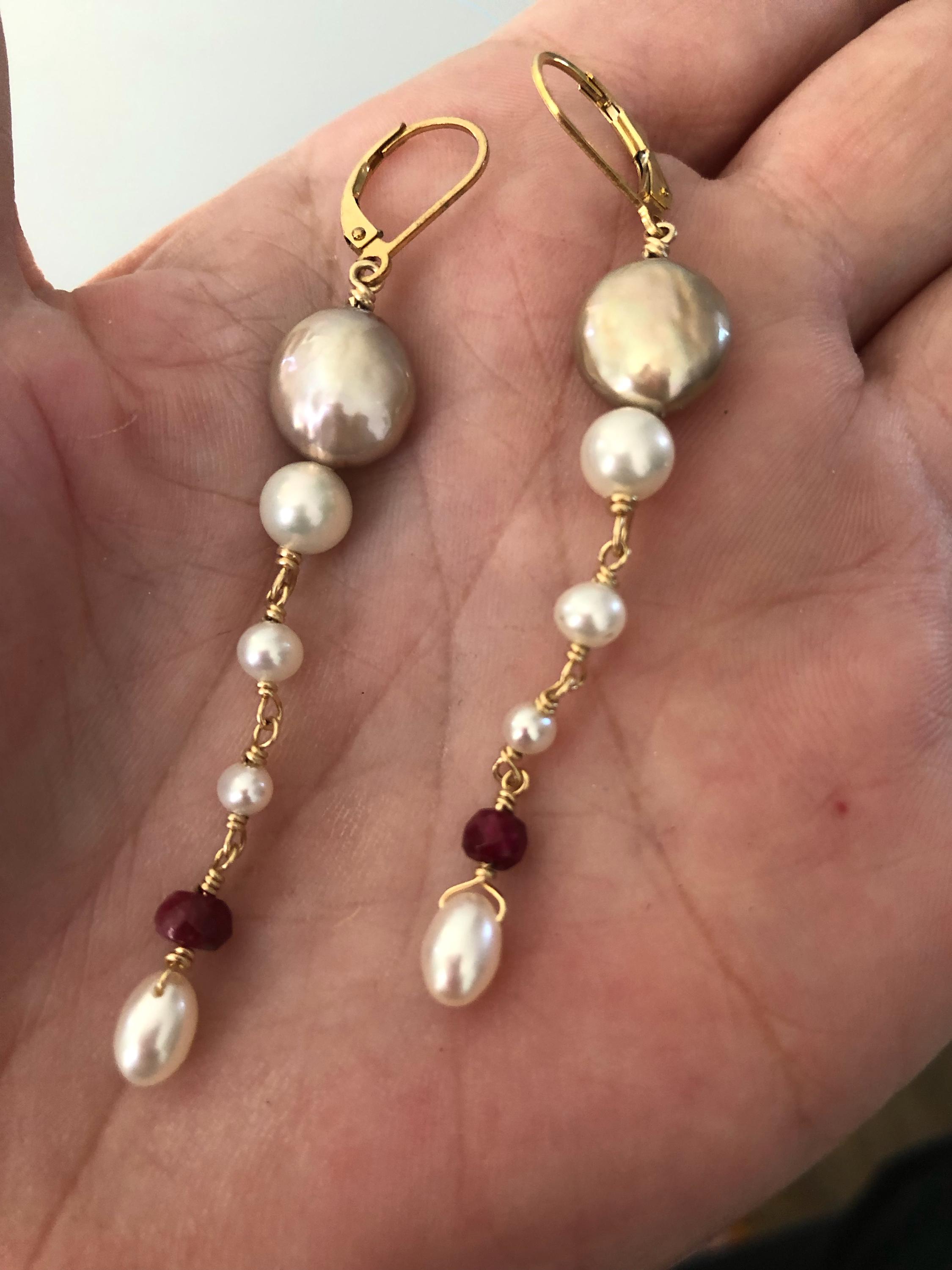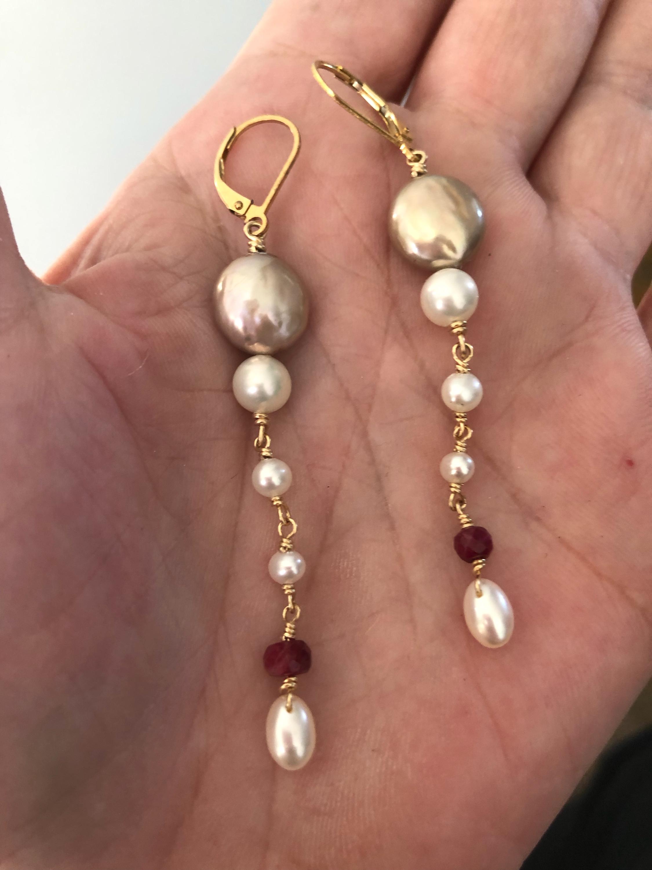 Thease are 14/20 yellow gold filled, long pearl earrings with a lottle Ruby at the bottom. They are 2 3/4 inches long and comfortably close securely with a Lever back ear finding. Perfect for fall🌸