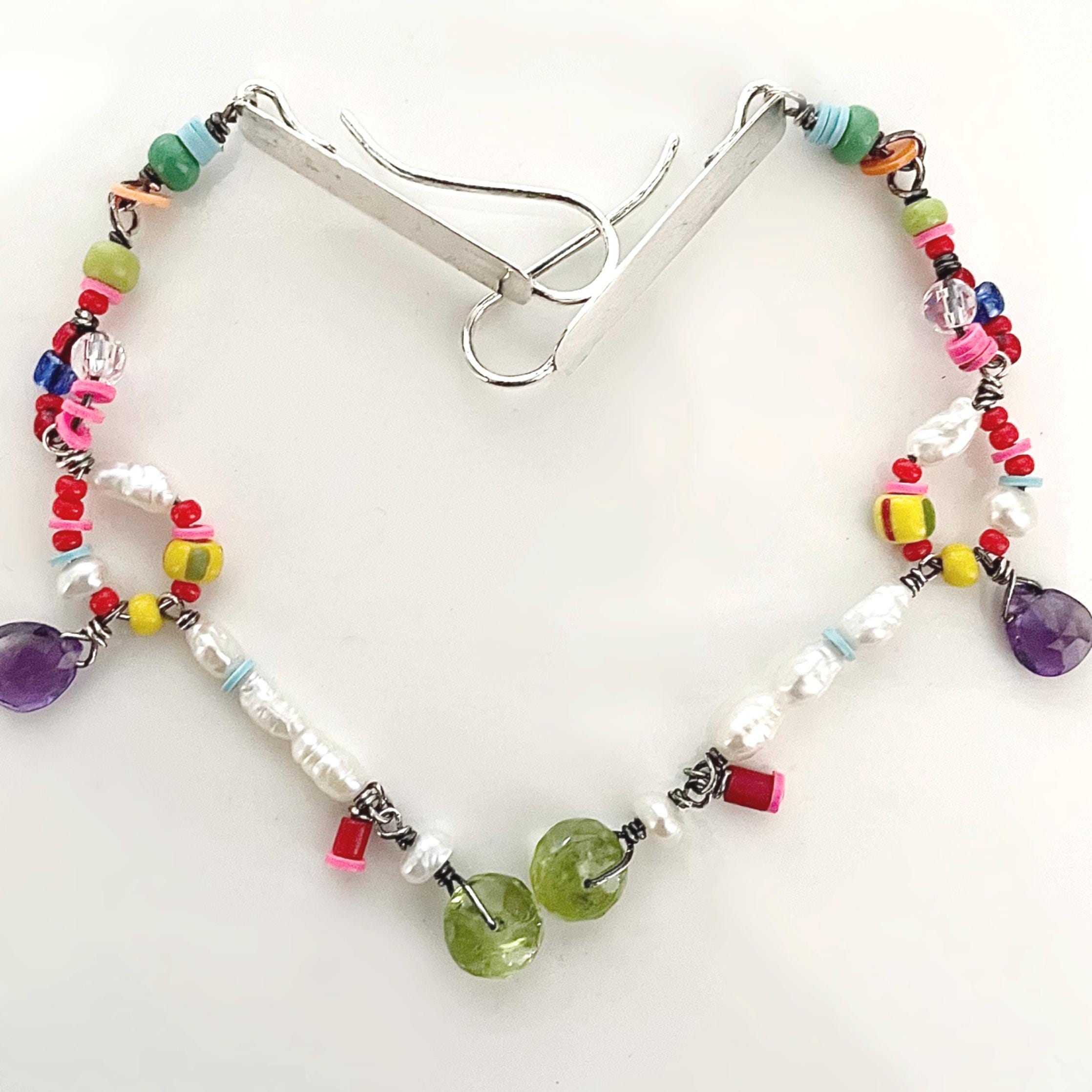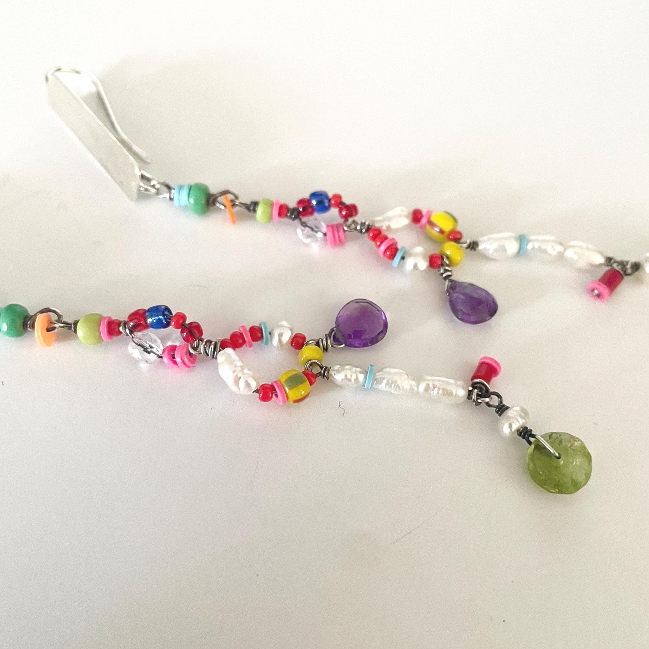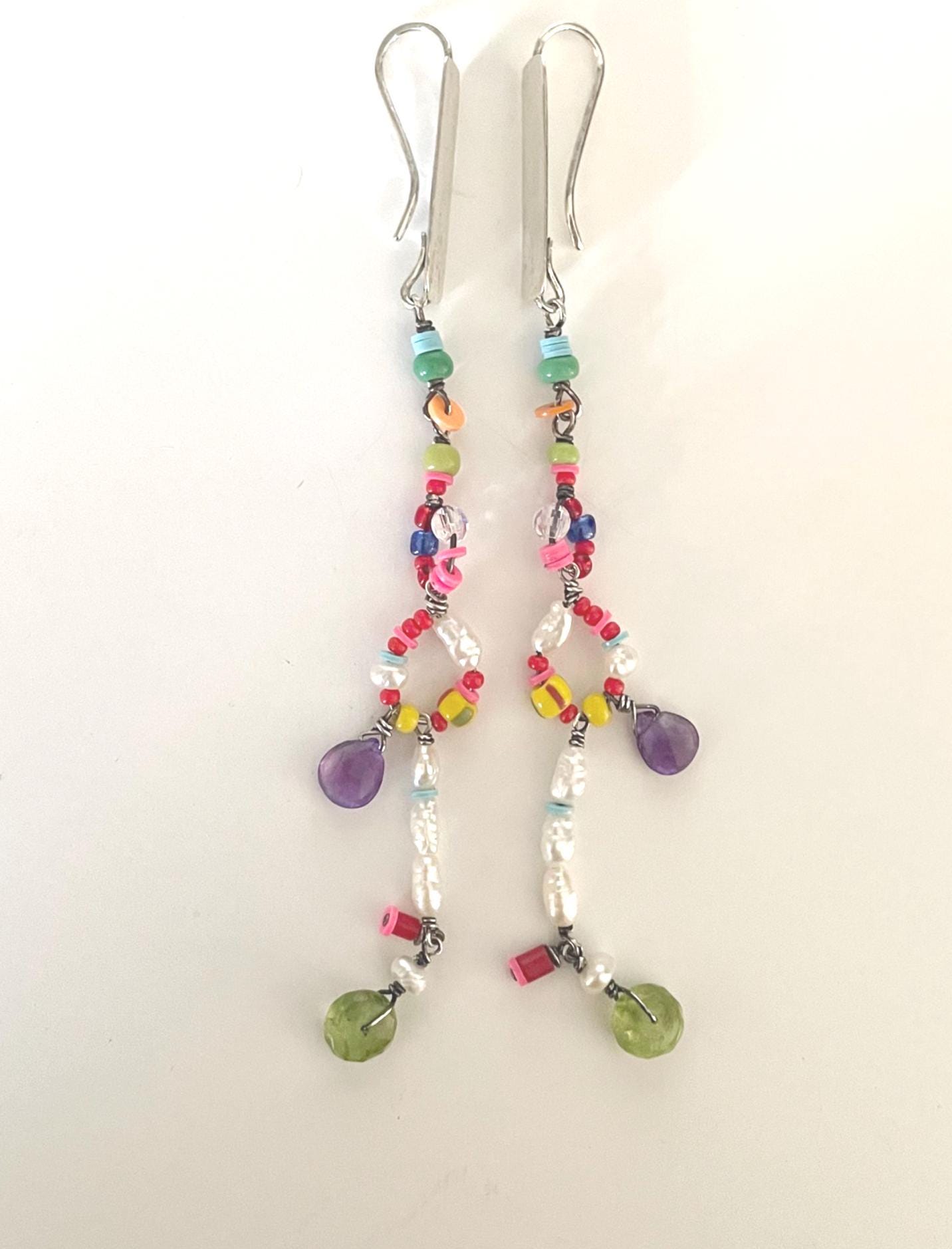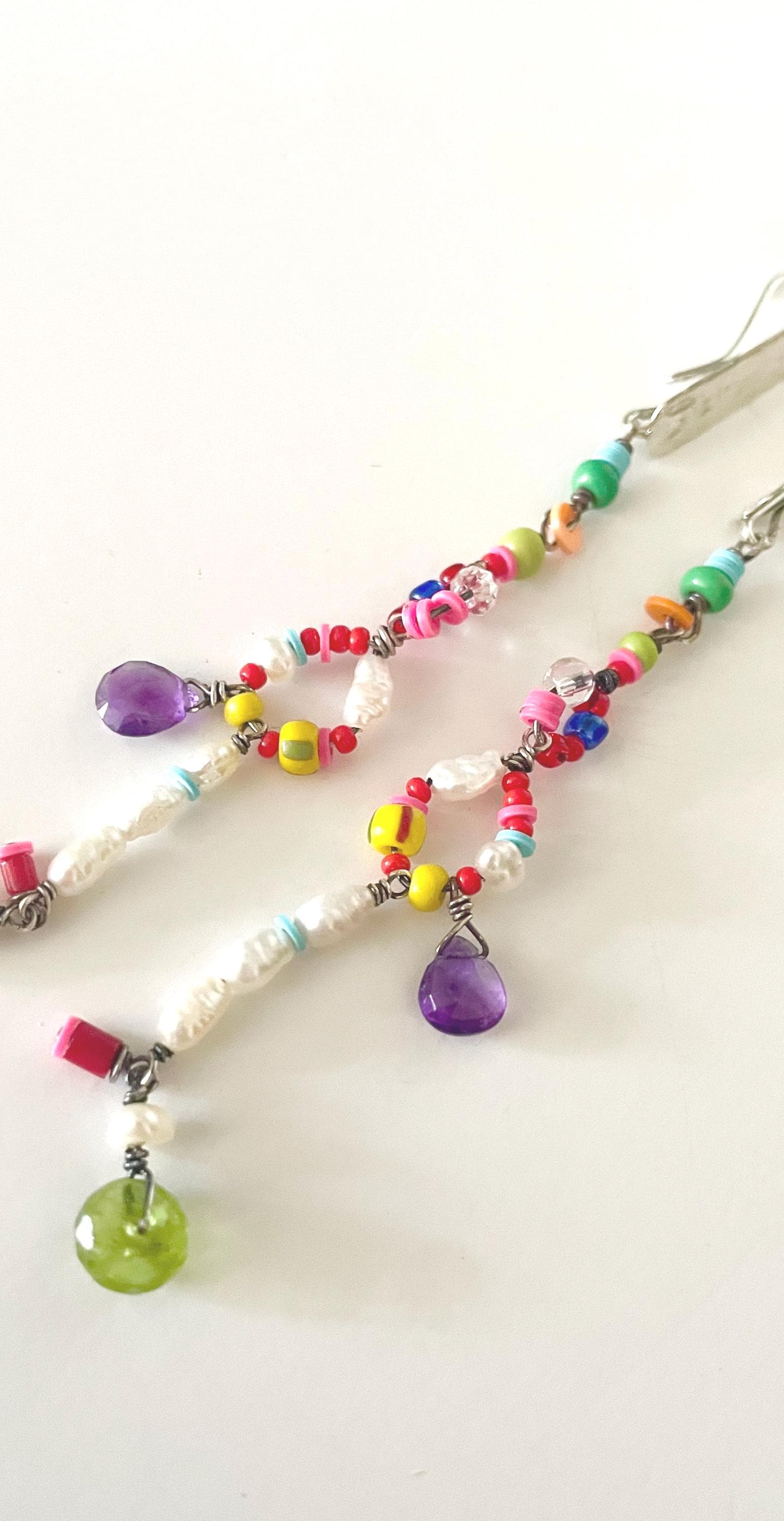 These are long, light weight beaded earrings with a handmade Sterling silver ear piece. All beads are wire wrapped in Sterling silver.