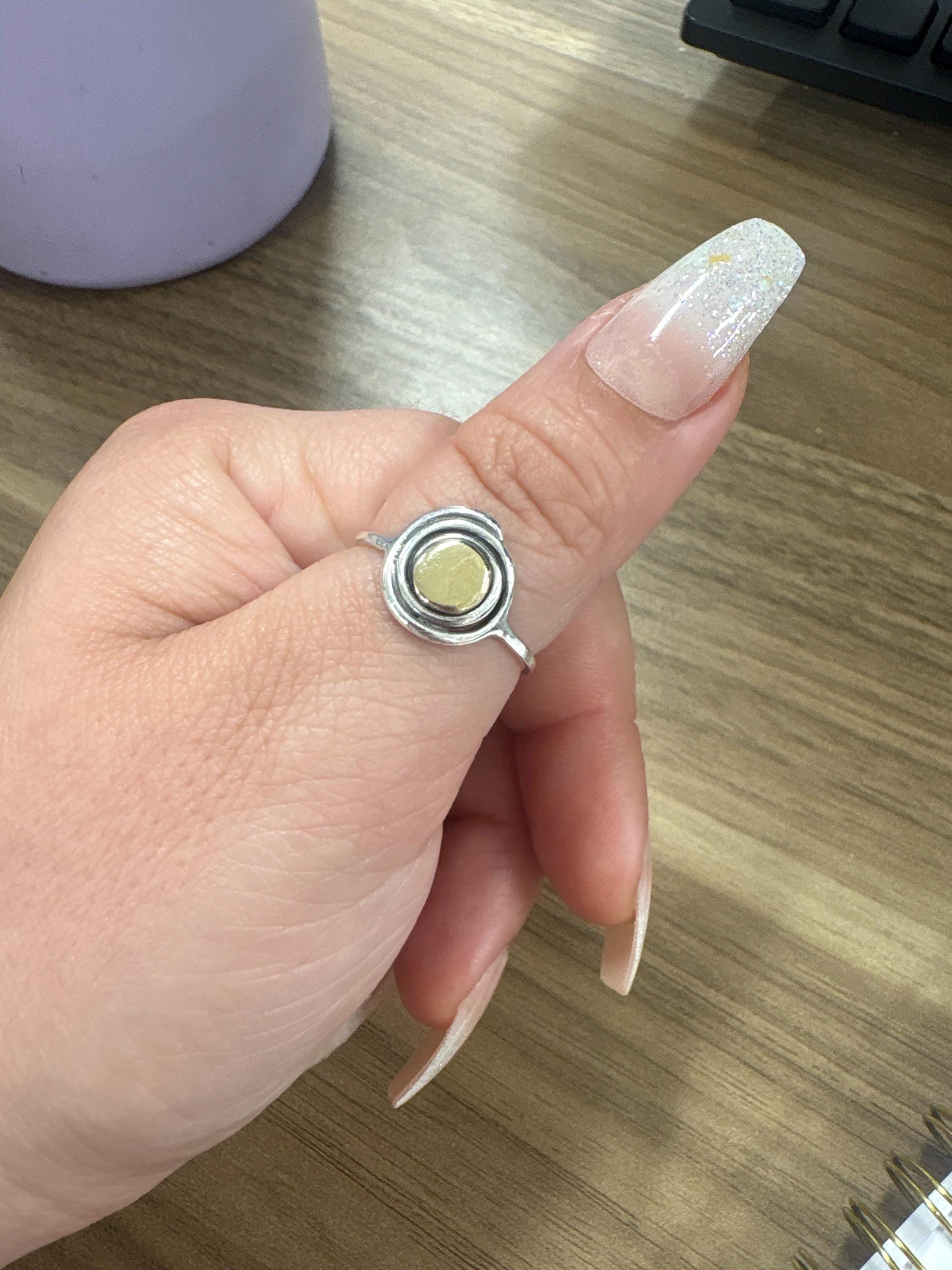 This is a handcrafted, delicate ring, that is formed out of 16 gauge Sterling silver wire with a recycled 14k yellow gold or yellow brass center.